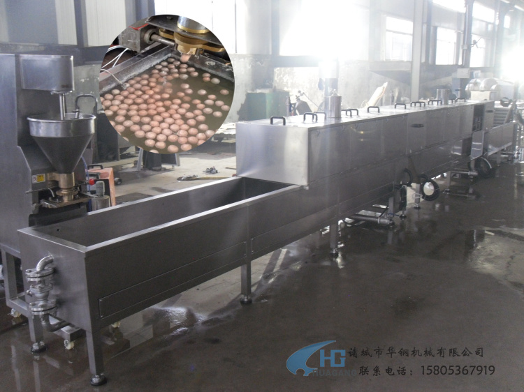 3.5.成型: 手工或用肉丸成型機, 調(diào)節(jié)好肉丸成型機的速度,使丸子飽滿溜圓,將成型機出來的雞肉丸立即放入80-85℃的熱水槽中浸煮3-5分鐘成型?;蛘叱尚蜋C出來的雞肉丸隨即放入滾熱的油鍋里油炸,炸至外殼呈漂亮的淺棕色或黃褐色為度。肉丸從油鍋里撈出,適當(dāng)冷卻后入沸水鍋中煮熟。