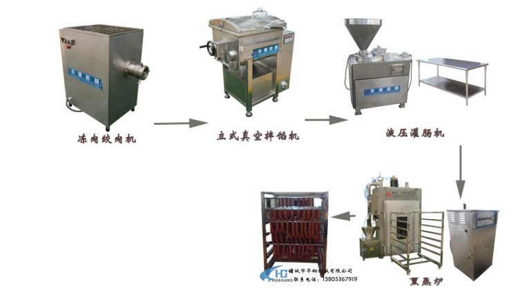 做香腸的話,主要設(shè)備有絞肉機+拌餡機+灌腸機+熏蒸爐設(shè)備。