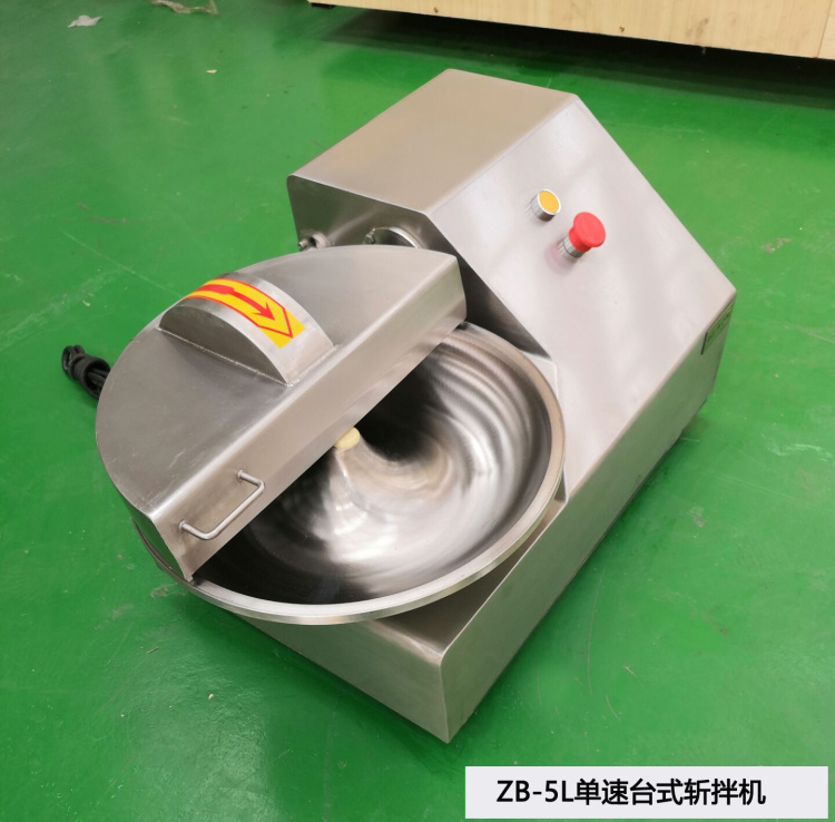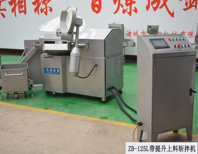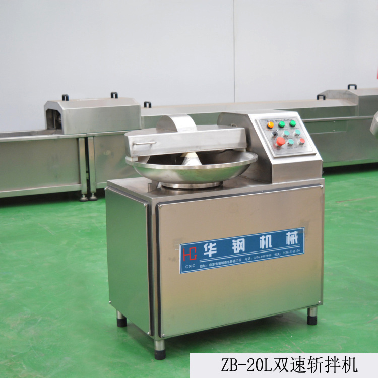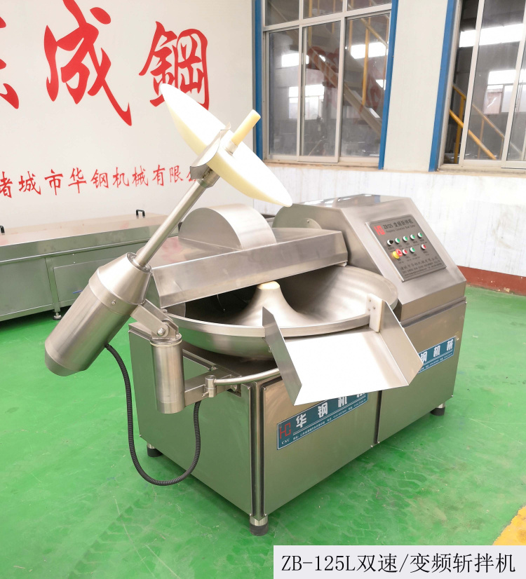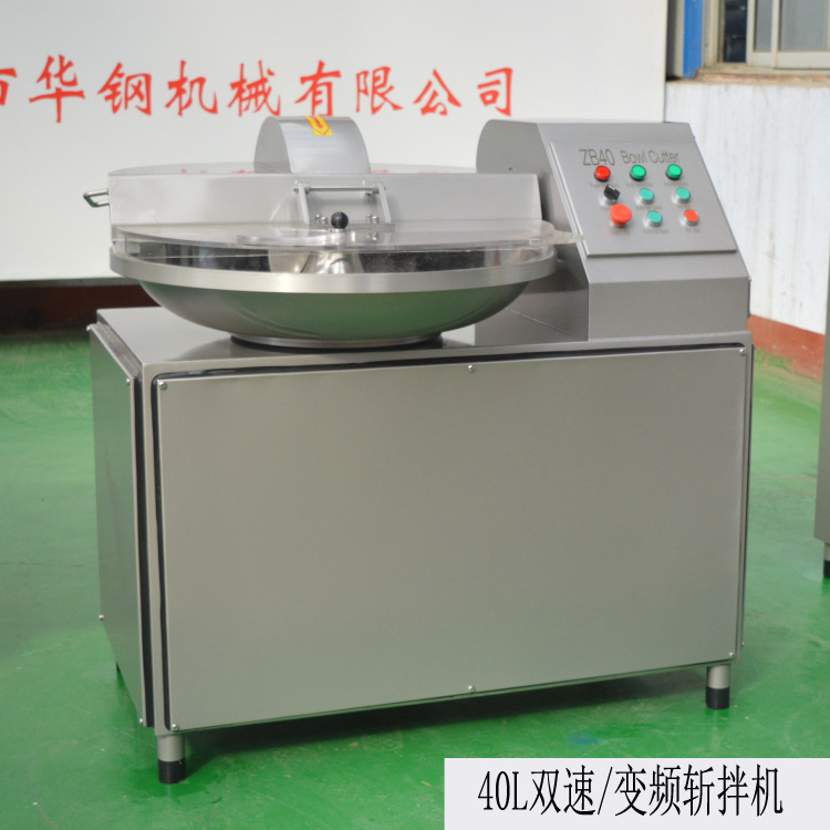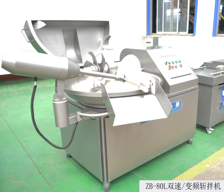 斬拌機是利用斬刀高速旋轉的斬切作用,將肉斬成肉餡或肉泥狀,還可以將肉、輔料、水一起攪拌成均勻的乳化物。本公司生產的斬拌機的刀速、鍋速、斬刀與轉鍋的間隙達到的組合,使斬切產品細度好、升溫小、斬拌時間短。