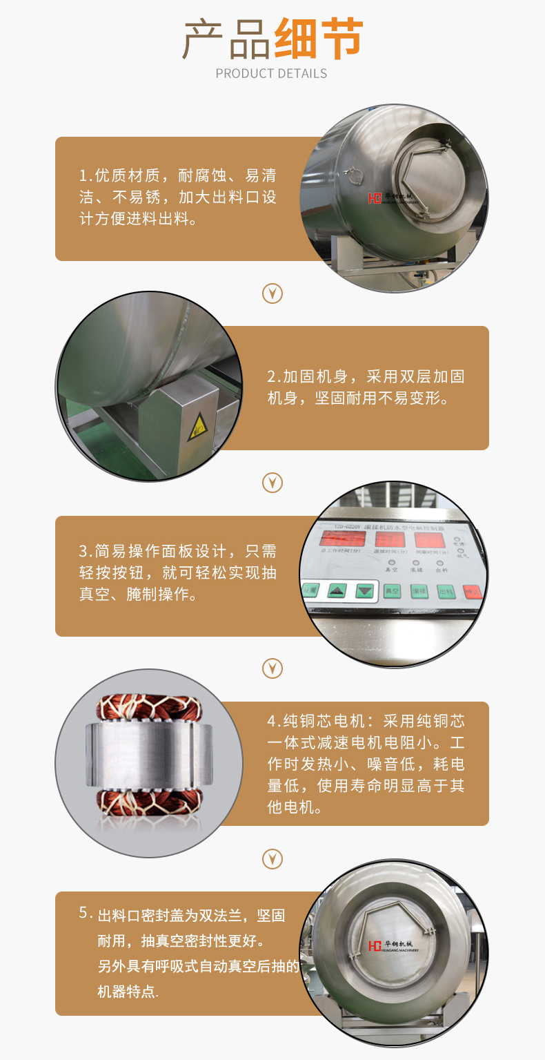 真空滾揉機(jī)是在真空狀態(tài)下,利用物理沖擊原理,讓肉塊或肉餡在滾筒內(nèi)上下翻動(dòng),相互撞擊、摔打,從而達(dá)到按摩、腌漬作用。腌漬液被肉充分地吸收,增強(qiáng)肉的結(jié)合力及彈性,提高產(chǎn)品的口感及斷面效果,可以增強(qiáng)保水性,增加出品率,可以改善產(chǎn)品的內(nèi)部結(jié)構(gòu)。主要適用于牛肉、羊肉、整雞鴨、豬肉等肉制品以及蔬菜。
