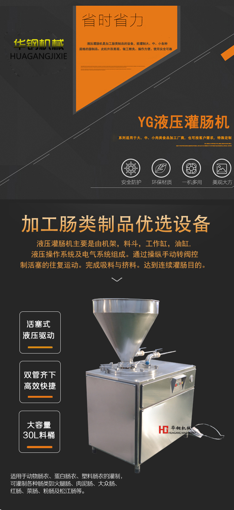 液壓灌腸機(jī)是加工腸類制品的設(shè)備,能灌制大、中、小各種規(guī)格的腸制品。此機(jī)外形美觀、做工精良、操作方便、使用安全可靠。機(jī)器的料斗、閥門、灌腸管以及整機(jī)外包裝均采用 不銹鋼制造,符合食品衛(wèi)生要求。