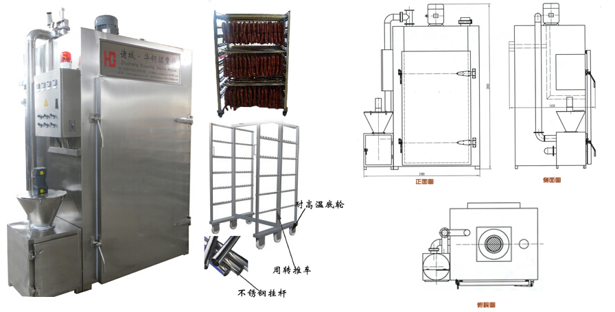 華鋼煙熏爐主要是由爐體、控制箱、發(fā)煙室三部分組成。爐體是進行煙熏上色蒸煮烘干的場所,上部有風扇、銅盤管,風扇的作用是在電機的帶動將吸上來的熱氣、煙霧進行擴散,達到均勻地效果。銅盤管是用于烘干功能時,蒸汽通過蒸汽預留口進入銅盤管內(nèi),銅導熱性好,傳熱速度快,并且增大了接觸空間,升溫速度更快,節(jié)能。電加熱管在兩側(cè),升溫速度快,受熱均勻。兩個溫度探頭,一個測爐內(nèi)溫度一個測食品溫度,外觀的幫助我們判斷產(chǎn)品的熟化狀態(tài)。爐內(nèi)兩側(cè)有獨立煙道,上部設(shè)有排氣口、排煙口,側(cè)面專門有蒸汽對流口,目的也是保證爐內(nèi)溫度、煙霧上下一致的效果,避免上下溫度不一致,煙熏色澤不一致的狀況。在爐內(nèi)的底部設(shè)有排水口,排除蒸汽遇冷凝結(jié)形成的水珠。