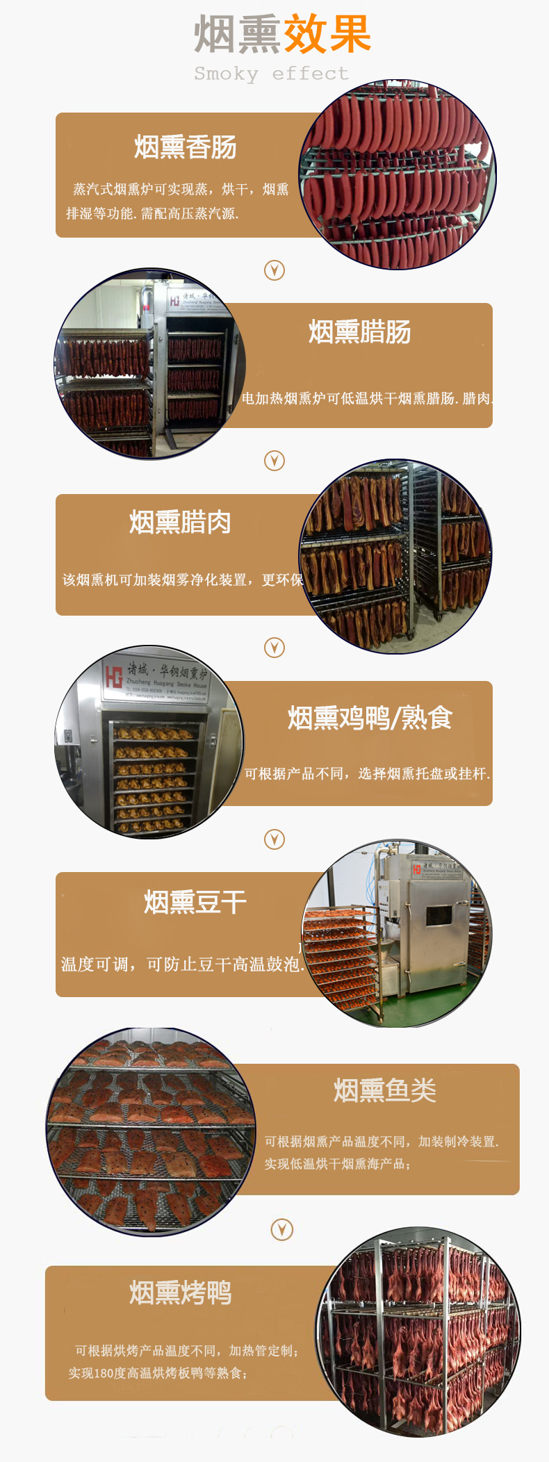 熱熏法溫度為50~85℃,通常在60℃左右,熏制時間4~6小時,是應(yīng)用較廣泛的一種方法。因為熏制的溫度較高,制品在短時間內(nèi)就能形成較好的煙熏色澤。熏制的溫度必須緩慢上升,不能升溫過急,否則產(chǎn)生發(fā)色不均勻,一般灌腸產(chǎn)品的煙熏采用這種方法。