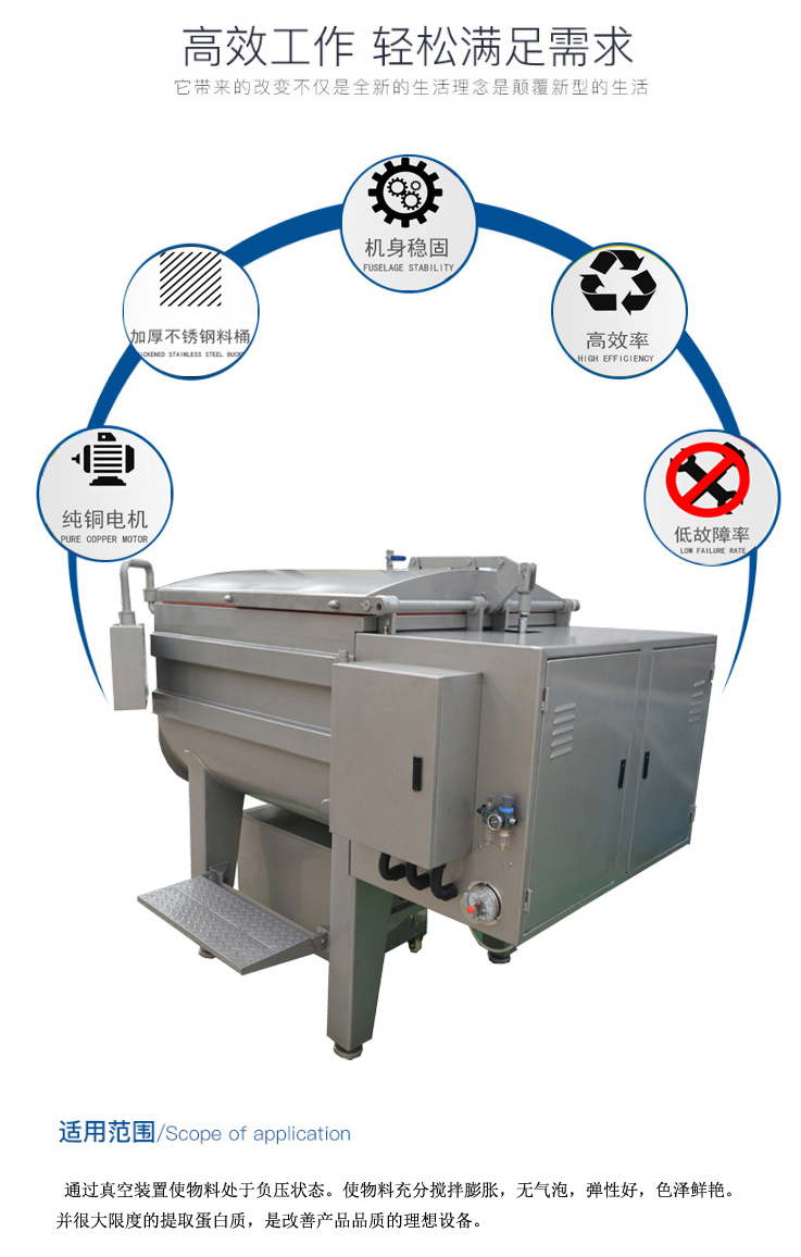 3、真空拌餡機(jī)在真空狀態(tài)下,餡料攪拌均勻,充分膨脹、彈性好、色澤鮮艷并大大限度地析出蛋白質(zhì)。