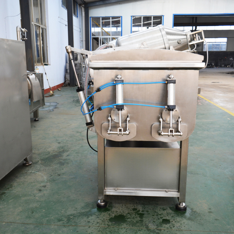 通過(guò)真空裝置使物料處于負(fù)壓狀態(tài)。使物流充分膨脹,無(wú)氣泡,彈性好,色澤鮮艷。并大大的限度的提取蛋白質(zhì),是改善產(chǎn)品品質(zhì)的理想設(shè)備。采用平行雙軸結(jié)構(gòu),斜板式槳葉,物料在料斗中翻動(dòng)的同時(shí)作圓周運(yùn)動(dòng),使各種物料攪拌的更加均勻.采用雙速雙動(dòng)力,根據(jù)所拌餡料的種類及工藝選擇不同的轉(zhuǎn)速和不同的運(yùn)轉(zhuǎn)方式進(jìn)行攪拌。真空密封裝置全部采用符合衛(wèi)生標(biāo)準(zhǔn)的 密封件。在真空狀態(tài)下,餡料攪拌均勻,充分膨脹,彈性好,色澤鮮艷并大限度地提高蛋白質(zhì)。上蓋及排料門(mén)的密封用 硅膠條,操作方便,可靠耐用.