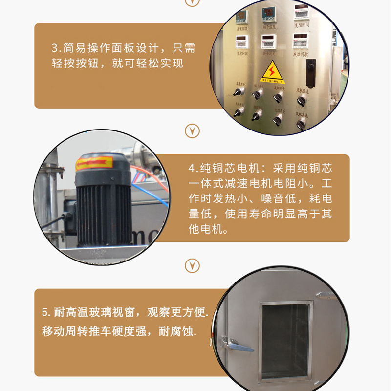 煙熏爐具備熱氣干躁或烤制的作用,蒸煮,煙熏和排氣功能。
