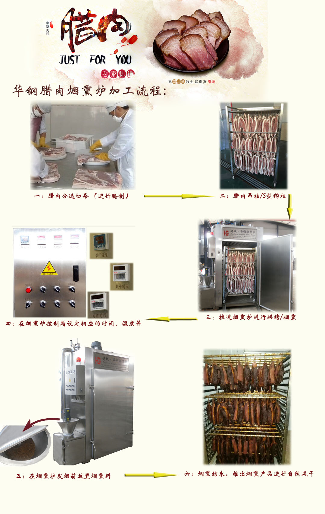 熏臘肉設(shè)備 在臘肉生產(chǎn)的過(guò)程中,煙熏是十分重要的環(huán)節(jié),它對(duì)產(chǎn)品的色澤、風(fēng)味有很大的影響,而傳統(tǒng)的柴火加熱熏肉方法是無(wú)法使得臘肉熏制均勻,同時(shí)煙灰可能粘連在肉品上,影響臘肉的口感。隨著市場(chǎng)上煙熏爐的出現(xiàn),進(jìn)而解決了傳統(tǒng)熏制的弊端。市場(chǎng)上煙熏爐除了具有臘肉熏制的功能,還具有蒸煮、干燥、烘烤、排風(fēng)、清洗等功能,可謂是一機(jī)多用。