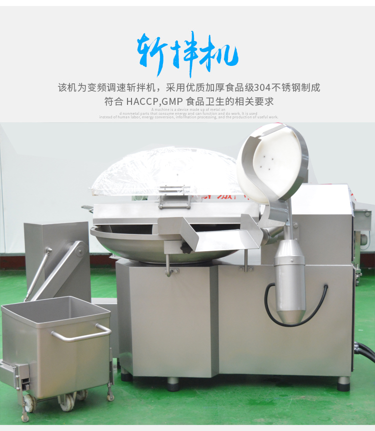 斬拌機(jī)選用不銹鋼作質(zhì)料,其構(gòu)造布局大方漂亮、在操作方面簡單清潔,達(dá)儀器衛(wèi)生標(biāo)準(zhǔn)技術(shù)、符合加工廠的操作,斬拌機(jī)的高速工作其特色能保證肉制品的斬切細(xì)度,發(fā)熱小,斬切時間短,進(jìn)步商品的彈性和出品率。斬刀選用進(jìn)口經(jīng)特別技術(shù)加工而成,斬鍋為鑄造全不銹鋼原料。