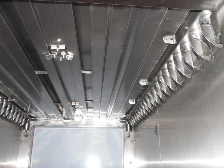 1爐體:爐體內(nèi)部所有構(gòu)件及外壁均采用不銹鋼制造,耐腐蝕。將制品掛在掛車上,送入爐體內(nèi),關(guān)好爐門,即可按設(shè)定工藝參數(shù)進(jìn)行蒸煮等加工。
