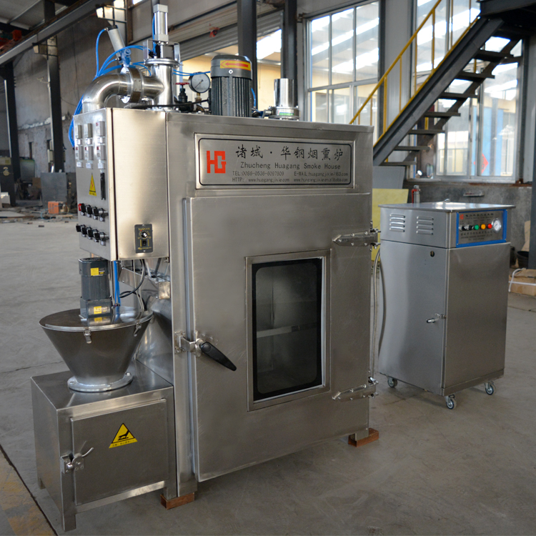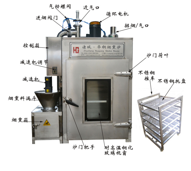 華鋼系列50型電加熱煙熏爐適用于煙熏臘腸,火腿,烤腸,培根,臘肉,烤雞,熏魚,烤鴨以及家禽,豆腐干等熏制產(chǎn)品,烘烤烘干,上色一次成型.煙熏色澤好,口感更佳.質(zhì)量保證,技術(shù)優(yōu)良,操作方便。經(jīng)過煙熏后食品的顏色好看,還有一種煙熏后的香味,讓人感覺香而不膩,也能達(dá)到環(huán)保效果,代替了傳統(tǒng)的煙熏爐方法,節(jié)省了工人的勞動(dòng)了,提高工作效率,更增強(qiáng)了食品的口感及彈性。
