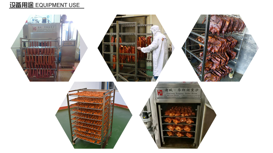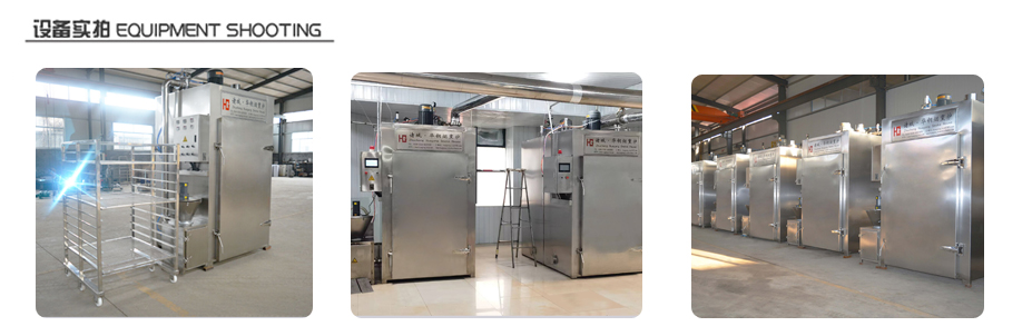 具有熱風(fēng)(干燥或烘烤)蒸煮、煙熏、排風(fēng)等功能。主要有主機(爐體)發(fā)煙裝置、主管路、高壓蒸汽系統(tǒng)、低壓蒸汽系統(tǒng)、電器控制部分等系統(tǒng)組成。