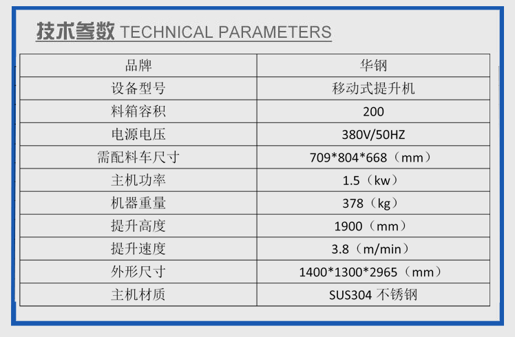 立式提升機是專為200L標準肉料車配套使用的提升設備,其功能是將料斗車內的物料傾倒入配套設備的料斗中,以完成加料工作。