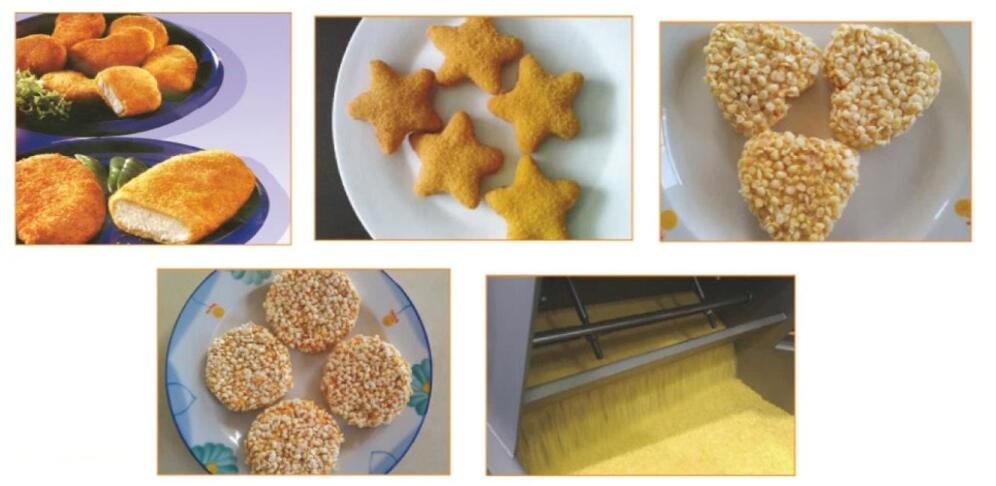 上面包屑機(jī)是通過料斗里泄出的面包屑和網(wǎng)帶上的面包屑將面包屑均勻裹涂在雞肉、牛肉、