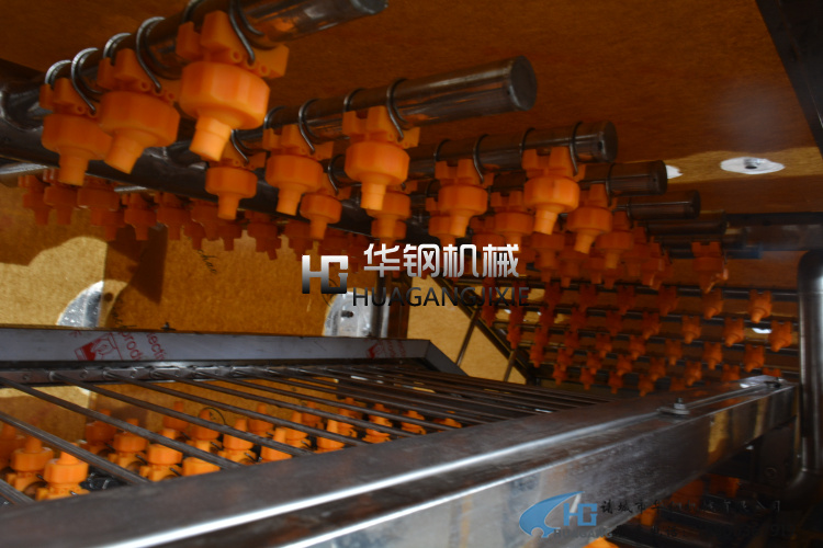 3.設(shè)備帶有高壓噴淋裝置,在清洗結(jié)束后輸送至下道工序過程中,對產(chǎn)品進行二次氣泡清洗,可加入臭氧殺 菌裝置,延長產(chǎn)品的保質(zhì)期;