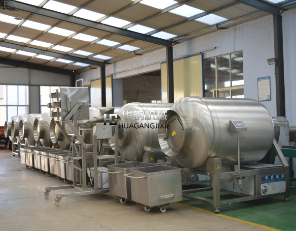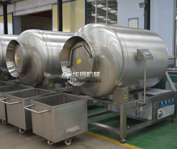 真空滾揉機(jī)是在真空狀態(tài)下,利用物理沖擊的原理,讓肉在滾筒內(nèi)上下翻動(dòng),相互撞擊、摔打,達(dá)到按摩、腌漬作用,使肉均勻的吸收腌漬,提高肉的結(jié)著力及產(chǎn)品的彈性,通過滾揉、按摩能使肉體蛋白質(zhì)分解成水溶性蛋白,易被人體吸收,同時(shí)能使添加料(淀粉等)與肉體蛋白質(zhì)互為融合以達(dá)到肉質(zhì)變嫩,口感好,出口率高。本機(jī)具有肺呼吸功能,讓產(chǎn)品在滾筒內(nèi)膨脹、縮小了往復(fù)運(yùn)動(dòng),改善了肉組織的結(jié)構(gòu),提高了切面效果。