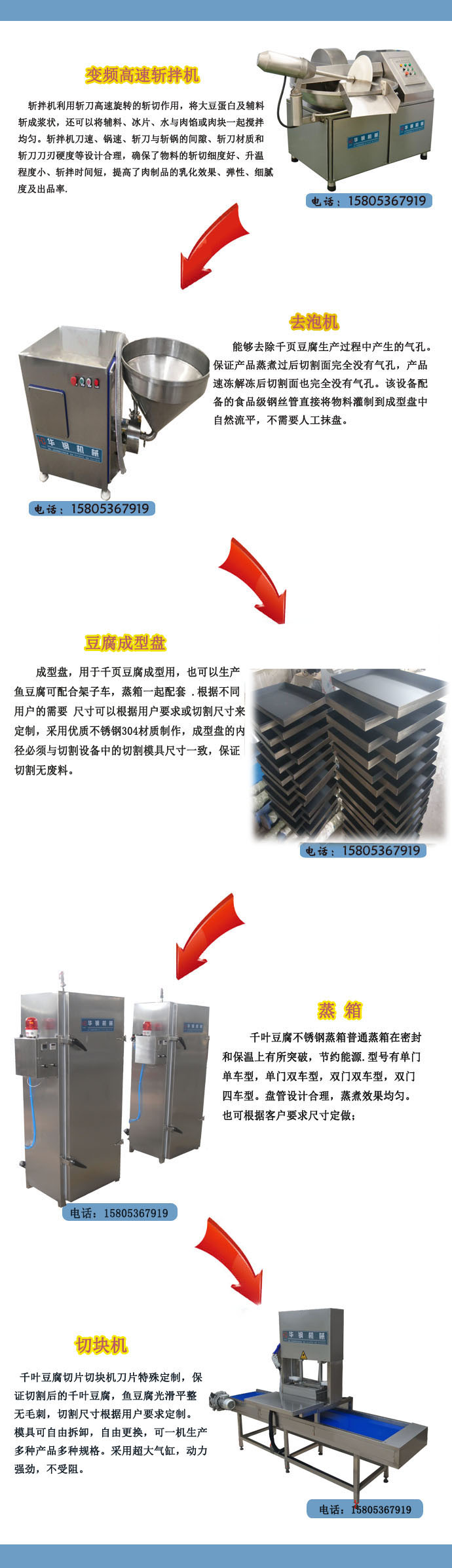 高速斬拌機(jī)、蒸箱,成型架車(chē)盤(pán)子,屬于必須設(shè)備。輔助設(shè)備切絲機(jī),切塊機(jī),去泡機(jī),切丁機(jī),切片機(jī)、鹵鍋、拌料機(jī)等,通過(guò)輔助設(shè)備生產(chǎn)不同產(chǎn)品的新式成品。銷(xiāo)量火爆,成本低,大豆蛋白便宜,成本低,售價(jià)大家都能接受,所以,選擇千頁(yè)豆腐生產(chǎn)設(shè)備 制作千葉豆腐在鄉(xiāng)村很暢銷(xiāo)。選擇千頁(yè)豆腐設(shè)備生產(chǎn)千頁(yè)豆腐售賣(mài)利潤(rùn)高,銷(xiāo)量大,是近幾年比較暢銷(xiāo)的一個(gè)項(xiàng)目,如果需要就來(lái)華鋼看看,千頁(yè)豆腐的廠(chǎng)家,15年老企業(yè),設(shè)備,技術(shù)都比較好。