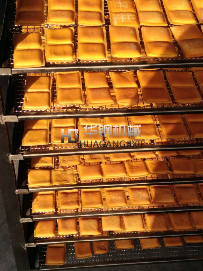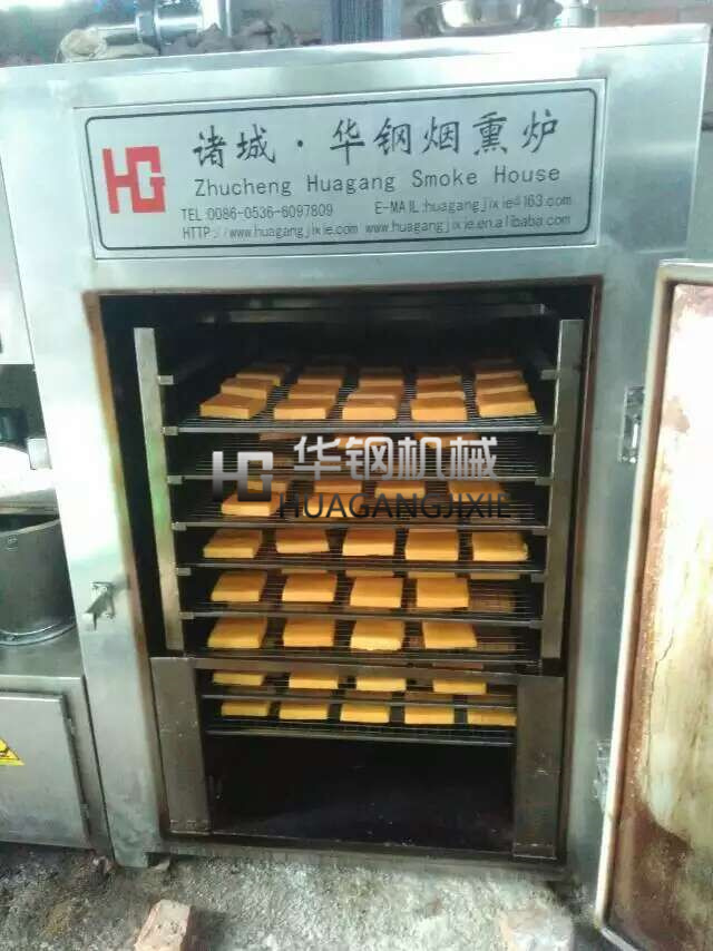 2.將放滿豆腐干的推車推到煙熏爐里面。關(guān)上爐門,通過豆干煙熏爐左側(cè)控制按鈕或者PLC電腦控制面板,設(shè)定溫度和時(shí)間,即可升溫,表皮稍微烘干后打開發(fā)煙開關(guān),煙霧即可在煙熏爐爐體內(nèi)部煙熏豆腐干。煙熏時(shí)間到后自動(dòng)報(bào)警,關(guān)閉發(fā)煙開關(guān),打開排煙開關(guān),將煙霧排到室外后,打開煙熏爐,即可看到煙熏完成的豆腐干。