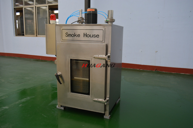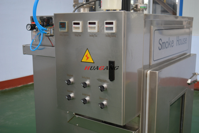 華鋼公司生產(chǎn)的HG-50煙熏爐設(shè)備一直備受廣大肉食中小企業(yè),自營店面,實(shí)驗(yàn)室等廠家的親睞。該設(shè)備不僅外觀精巧,占地面積小,無噪聲,使用方便,而且對生產(chǎn)周圍環(huán)境不會(huì)照成污染,安全性能高等優(yōu)點(diǎn)。該設(shè)備材質(zhì)全部采用SUS304不銹鋼材質(zhì)。更符合食品級要求! 該煙熏爐設(shè)備發(fā)煙裝置為標(biāo)準(zhǔn)內(nèi)置發(fā)煙,在爐體內(nèi)底部中心位置,配有高溫發(fā)煙盤裝置,在我們指定的發(fā)煙盒位置可根據(jù)客戶要求,放置 木屑,果糖,木粉,稻殼米糠等煙熏發(fā)煙產(chǎn)品,以對產(chǎn)品進(jìn)行煙熏。當(dāng)客戶的產(chǎn)品通過推車進(jìn)到煙熏爐內(nèi),關(guān)好爐門,通過左側(cè)一系列控制開關(guān),打開烘干開關(guān),發(fā)煙開關(guān)等.來滿足客戶對產(chǎn)品需求的加工生產(chǎn)。爐門裝置配有高溫雙層玻璃視窗,可看到爐體內(nèi)部產(chǎn)品上色情況等。