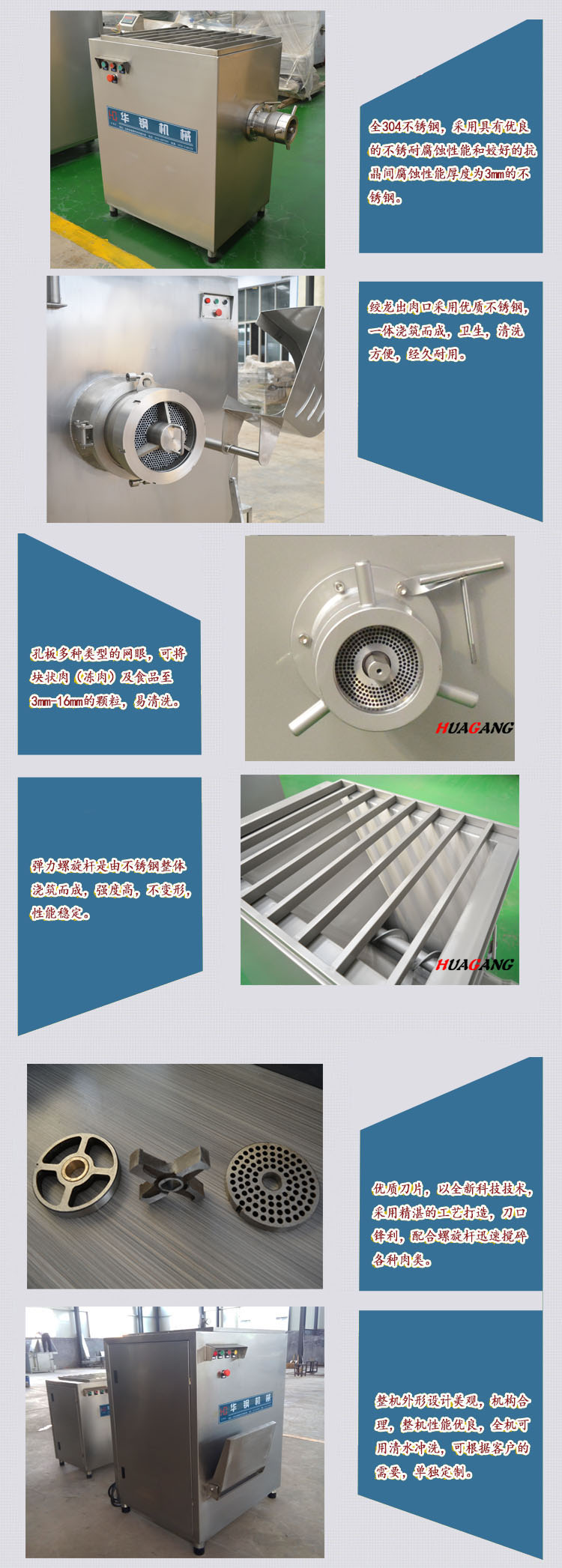 凍肉絞肉機(jī)是肉制品生產(chǎn)行業(yè)中通用性高、使用范圍廣的一種肉食加工設(shè)備。它是依靠螺桿將料斗箱中的原料肉推到預(yù)切板處,通過(guò)螺桿的旋轉(zhuǎn)擠壓使孔板與絞刀產(chǎn)生相對(duì)質(zhì)運(yùn)轉(zhuǎn),從而將原料肉切成顆粒形狀,確保了肉餡的均勻性。通過(guò)孔板的不同組合可達(dá)到理想的要求的不同肉餡。