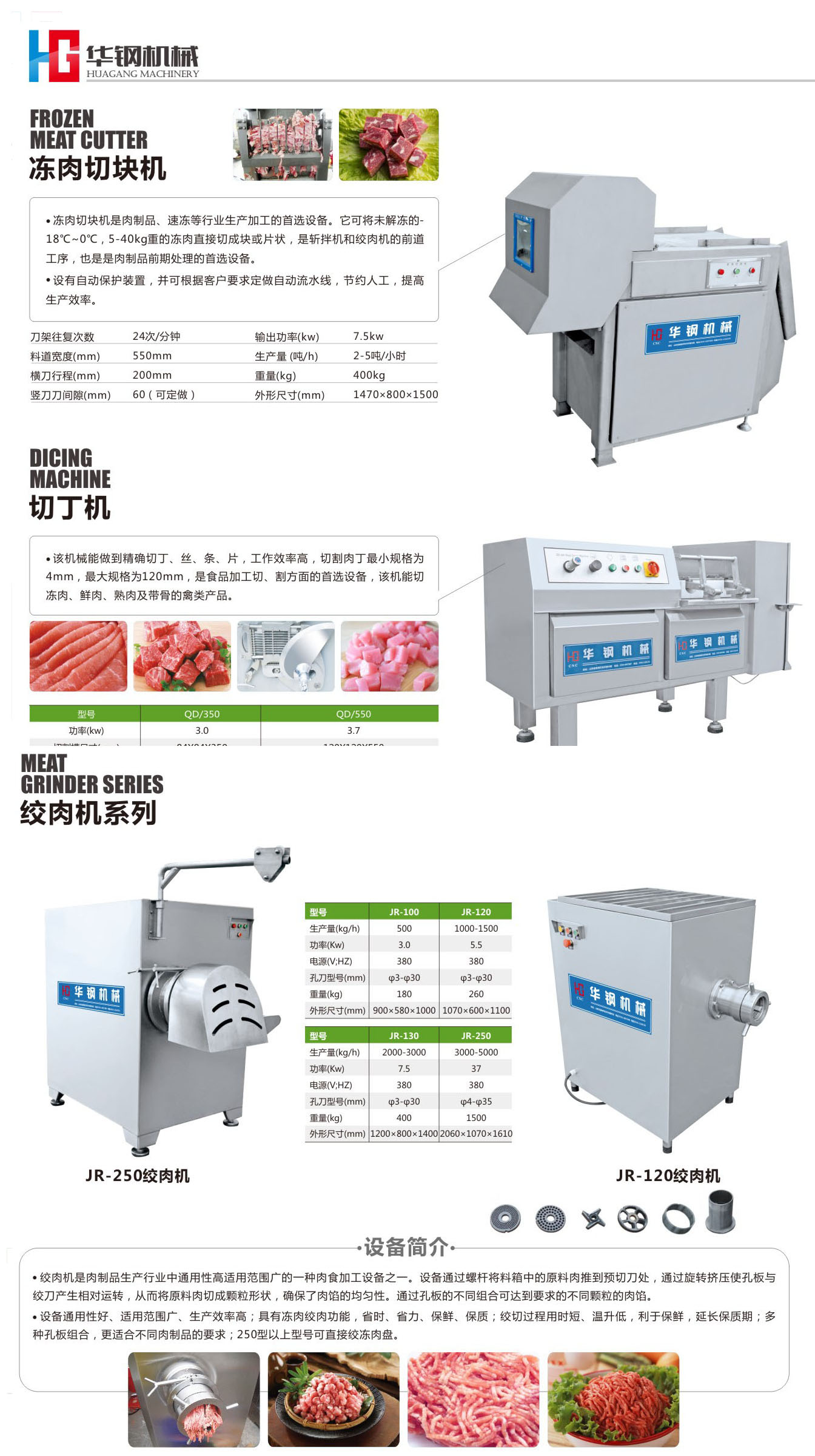 本機整體采用不銹鋼材料加工制作,安全防護性能好,切割零件拆卸簡易,切凍肉丁機易于清洗,網(wǎng)格刀,切割厚度可通過液壓自行調(diào)整,以滿足不同厚度的需要;多功能切凍肉丁機預壓設計,保證切出肉塊的均勻。切豬肉丁機超大進料倉,設有入料產(chǎn)品鎖緊裝置,大型凍肉切丁機,特殊的液壓動力系統(tǒng)、切割更加強勁有力,特制格柵刀片、穿透性強,連續(xù)加工肉品無粘連,多功能切凍肉丁機S型斬刀切削鋒利、切凍肉丁機,截面光滑、外形漂亮,凍肉切丁機能將零下3-4攝示度的凍肉一次性切成肉丁。