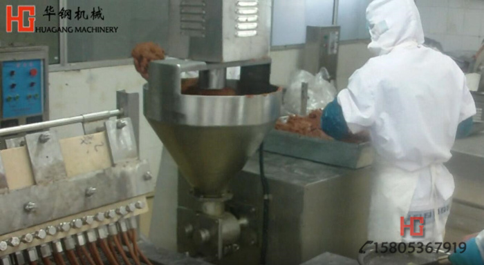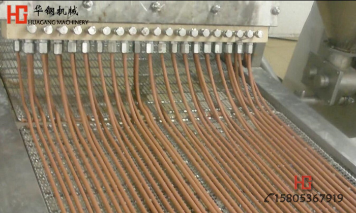 狗糧肉條擠出機(jī)采用液壓形式擠出,對于肉類特干,特大肉塊的料有很好的效果,不用腸衣,擠出后直接烘干,切斷,包裝。出料口一次可以出8根或者16根。 效率高,出來的產(chǎn)品粗細(xì)均勻,適用于各種寵物腸的生產(chǎn).