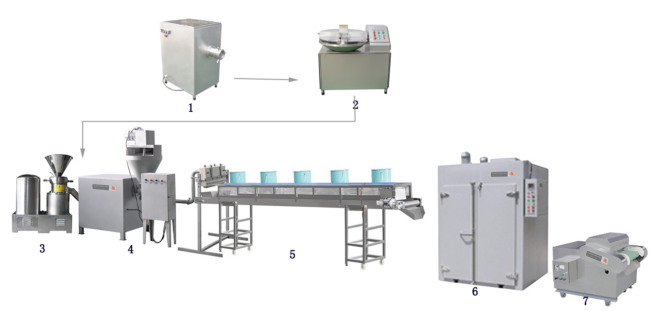 原料絞碎成肉顆?!饽嗳怵W混合料斬拌成肉漿狀→骨泥混合(可選)→肉條擠出線→烘干箱進(jìn)行肉條烘干→肉條切割→包裝