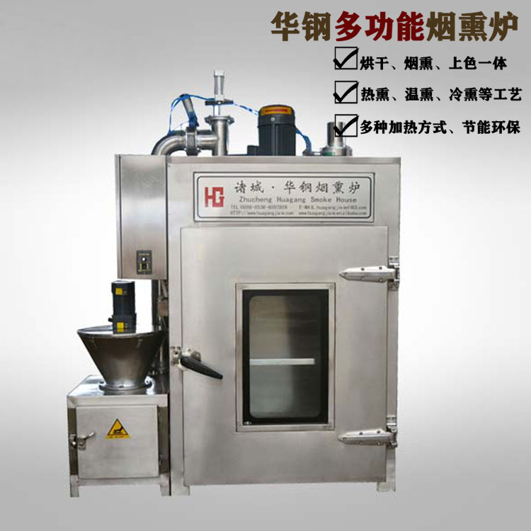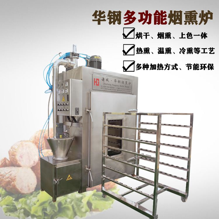 華鋼煙熏爐主要是由爐體、控制箱、發(fā)煙室三部分組成。爐體是進(jìn)行煙熏上色蒸煮烘干的場所,上部有風(fēng)扇、銅盤管,風(fēng)扇的作用是在電機(jī)的帶動將吸上來的熱氣、煙霧進(jìn)行擴(kuò)散,達(dá)到均勻地效果。銅盤管是用于烘干功能時,蒸汽通過蒸汽預(yù)留口進(jìn)入銅盤管內(nèi),銅導(dǎo)熱性好,傳熱速度快,并且增大了接觸空間,升溫速度更快,節(jié)能。電加熱管在兩側(cè),升溫速度快,受熱均勻。兩個溫度探頭,一個測爐內(nèi)溫度一個測食品溫度,外觀的幫助我們判斷產(chǎn)品的熟化狀態(tài)。爐內(nèi)兩側(cè)有獨(dú)立煙道,上部設(shè)有排氣口、排煙口,側(cè)面專門有蒸汽對流口,目的也是保證爐內(nèi)溫度、煙霧上下一致的效果,避免上下溫度不一致,煙熏色澤不一致的狀況。在爐內(nèi)的底部設(shè)有排水口,排除蒸汽遇冷凝結(jié)形成的水珠。