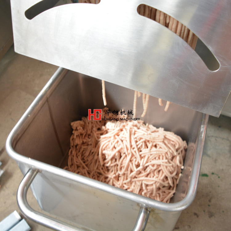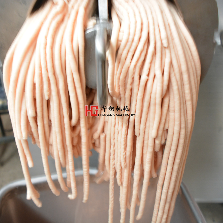 250凍肉絞肉機、大肉塊凍肉絞肉機是肉制品生產(chǎn)行業(yè)中使用范圍較廣的一種肉食加工設備 。它能將-18℃的凍肉凍盤直接絞成顆粒狀。它依靠螺桿將料斗中的原料肉推到預切切板處,通過螺桿的旋轉擠壓使孔板與絞刀產(chǎn)生相對運轉,從而將原料肉切成顆粒形狀,確保了肉餡的均勻性。通過也板的不同組合可達到理想要求的不同肉餡。