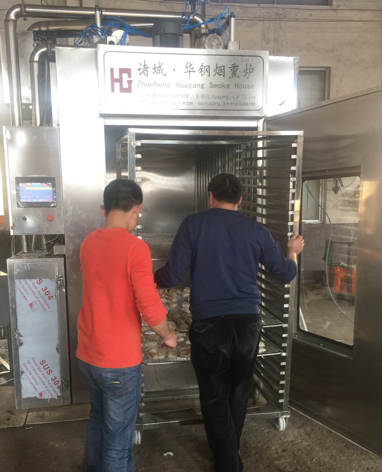 煙熏根據(jù)處理溫度的高低可將煙熏分為冷熏、溫熏、熱熏,這三者沒有明顯的界線,各自劃分的溫度區(qū)域也不盡相同。在日本把0~30℃定為冷熏,30~50℃為溫熏,50~80℃為熱熏,80℃以上的稱為烘熏。加熱和干燥對發(fā)生美拉德反應(yīng)起著促進(jìn)作用,因此熱熏產(chǎn)品的色澤明顯好于冷熏,但是熱熏時由于溫度過高,肌肉蛋白質(zhì)要產(chǎn)生熱變性,脂肪熔化,使產(chǎn)品品質(zhì)發(fā)生改變。另外,隨著爐溫的升高,被煙熏的肉制品表面迅速干燥,表面過早干結(jié),反而會阻礙對煙霧的吸收,而冷熏則不會引起上述變化。一般情況下,熱熏時間短,冷熏時間長,對于非加熱的產(chǎn)品常采用冷熏的方式,有的產(chǎn)品需要冷熏半日至數(shù)日之久。如果主要想提高煙熏香味的嗜好性,又想延長制品的保存期,也可以采用溫熏的方式,它可以有利于特定的、有益菌為主菌群的形成。至于采用何種熏制方式,這與產(chǎn)品的類型及人們的嗜好口味有關(guān)。