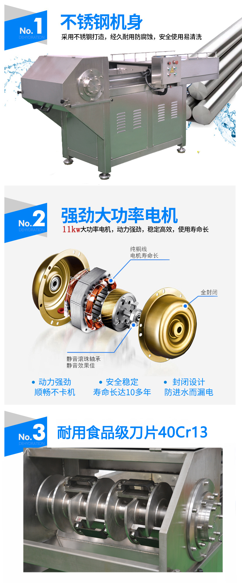 1.加工原料規(guī)格600×400×150/200(mm),每塊2.5~25kg、-4℃~-18℃的凍肉,可直接切成塊狀或片狀,是斬拌機(jī)和絞肉機(jī)的前道工序。