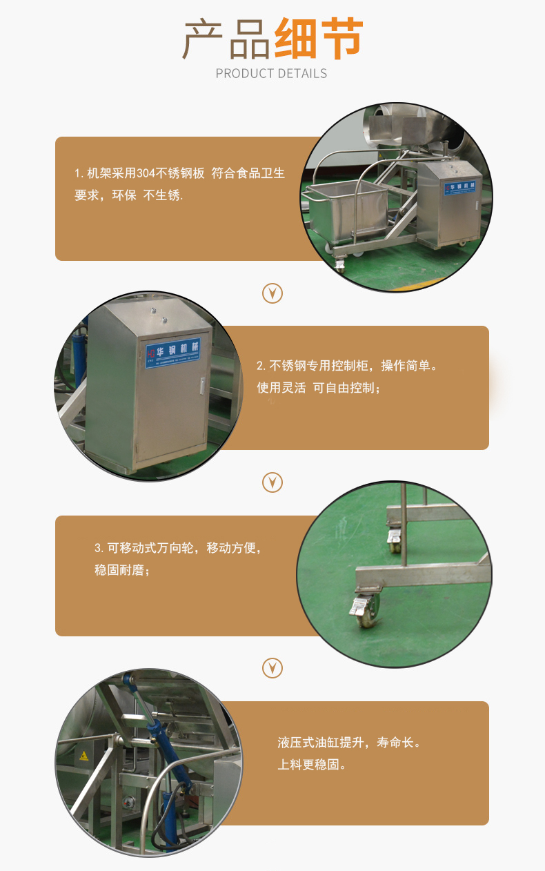本提升機適應(yīng)大、中、小型肉類食品加工廠,是為滾揉機、灌腸機、攪拌機、絞肉機等設(shè)備提供物料的設(shè)備。本機采用304不銹鋼制作,設(shè)備可自由移動,更加方便快捷,減輕了勞動強度,提高了生產(chǎn)效率。