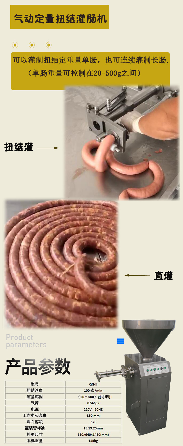 氣動定量扭結(jié)灌腸機外形美觀,小巧玲瓏。與肉食接觸部分及外包裝全部采用不銹鋼制造。易于清洗,定量可在20-500克之間任意可調(diào),誤差僅有3克左右。氣動定量扭結(jié)灌腸機,采用控制閥開關(guān)汽缸來調(diào)整加工產(chǎn)品所屬重量,通過操作面板上按鈕達到控制各個程序動作的目的。該設(shè)備是在定量灌腸機的基礎(chǔ)上加以研制的灌腸設(shè)備,該機既能定量灌腸又能自動扭結(jié),改變了過去定量灌腸扭結(jié)不能一次完成的不足,該機性能穩(wěn)定,操作安全可靠,在原有的基礎(chǔ)上提高了生產(chǎn)效率.