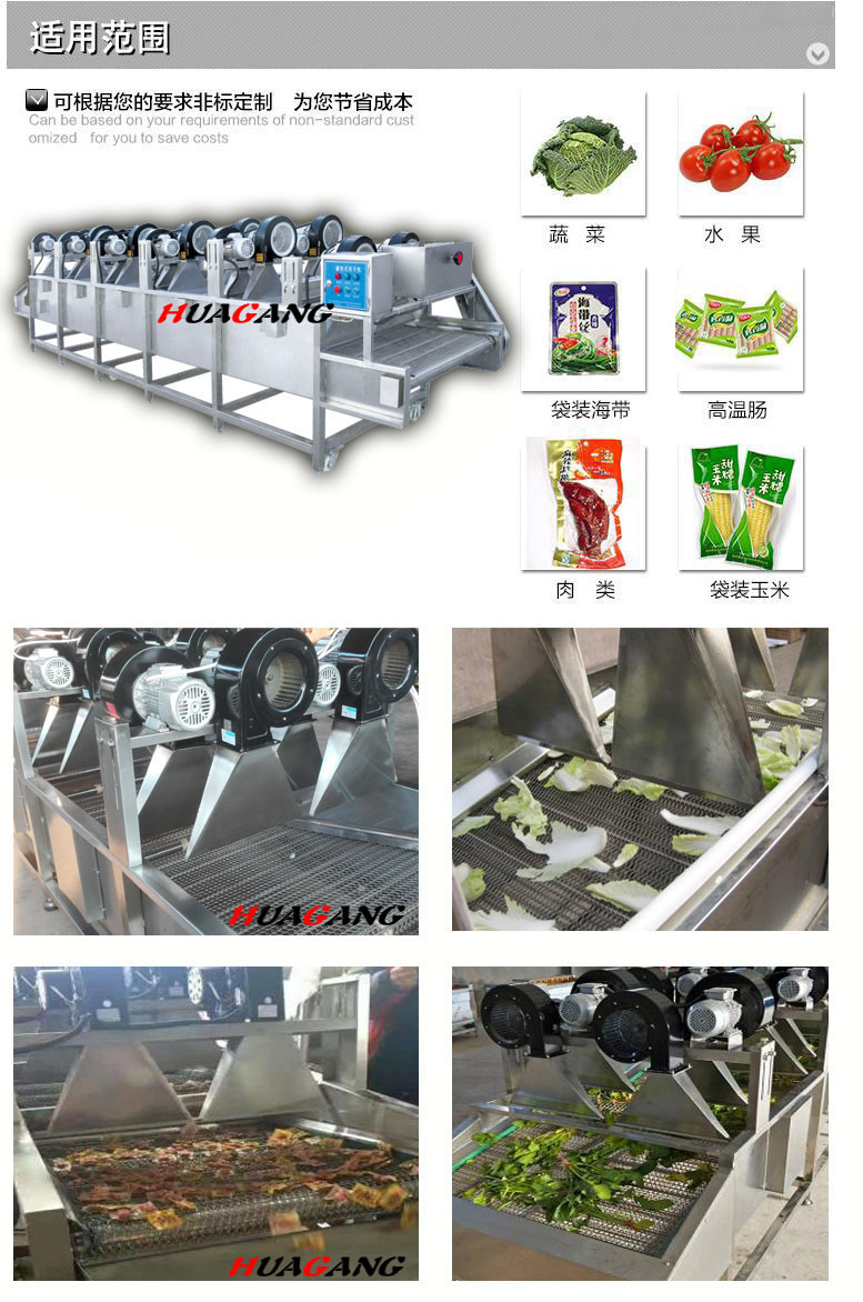 本機適用于滅菌后的高低溫肉制品、蔬菜制品等軟包裝產(chǎn)品滅菌后的除水工作,亦適用于蔬菜清洗后表面水的去除。通過多次翻身瀝水,及上部高壓強冷風吹,使軟包裝完全達到表面水珠吹干的效果(袋面皺紋間的存水也能干)。此設備與殺菌機相連并速度同步,每臺風機功率:0.75KW,設備環(huán)保節(jié)能。