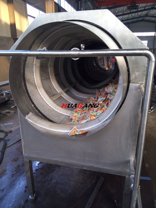洗袋機(jī)內(nèi)部用毛刷做成螺旋狀,在清洗的過(guò)程中通過(guò)筒體的不斷旋轉(zhuǎn),袋裝食品也隨著不斷轉(zhuǎn)動(dòng),與毛輥不斷接觸對(duì)包裝表面的油污進(jìn)行清洗,內(nèi)部還加入了噴淋不斷沖洗物料。而且清洗段分為兩段清洗,前段可以針對(duì)產(chǎn)品加入一定的清潔劑以及消毒液之類(lèi)的,后段進(jìn)行二次清水清洗。設(shè)計(jì)更加合理與人性化。