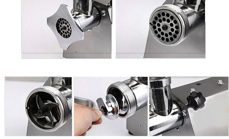 小型絞肉機(jī)工作原理主要靠旋轉(zhuǎn)的螺桿交料斗中的原料肉推擠到絞刀箱中的預(yù)切孔板處,利用轉(zhuǎn)動(dòng)的切刀刃和孔板上孔眼刃形成的剪切作用將肉切碎,并在螺桿擠壓力的作用下,將肉粒不斷排出孔板處。這樣,料斗中的肉不斷通過(guò)螺桿進(jìn)入絞刀箱,而肉靡斷被排出機(jī)外。