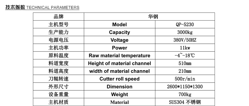 該設備采用液壓系統(tǒng)做動力,將原料肉通過推料缸輸送,原料肉滑到切刀的擋塊部位,