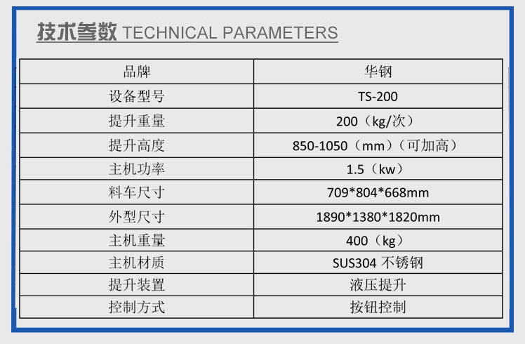 使用液壓油提升,保持上料平穩(wěn),出料干凈,提升高度可調(diào),速度可調(diào),單次提升能力為200KG,是食品廠減輕工人勞動強度的設備,本機采用不銹鋼制作,外型美觀,經(jīng)濟實用,一臺上料機可供幾臺滾揉機上料交替使用,設備四腳帶輪子,可移動,并帶有剎車系統(tǒng),上料時不會隨意移動保證了設備的使用安全.